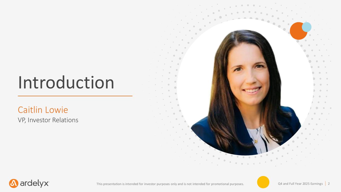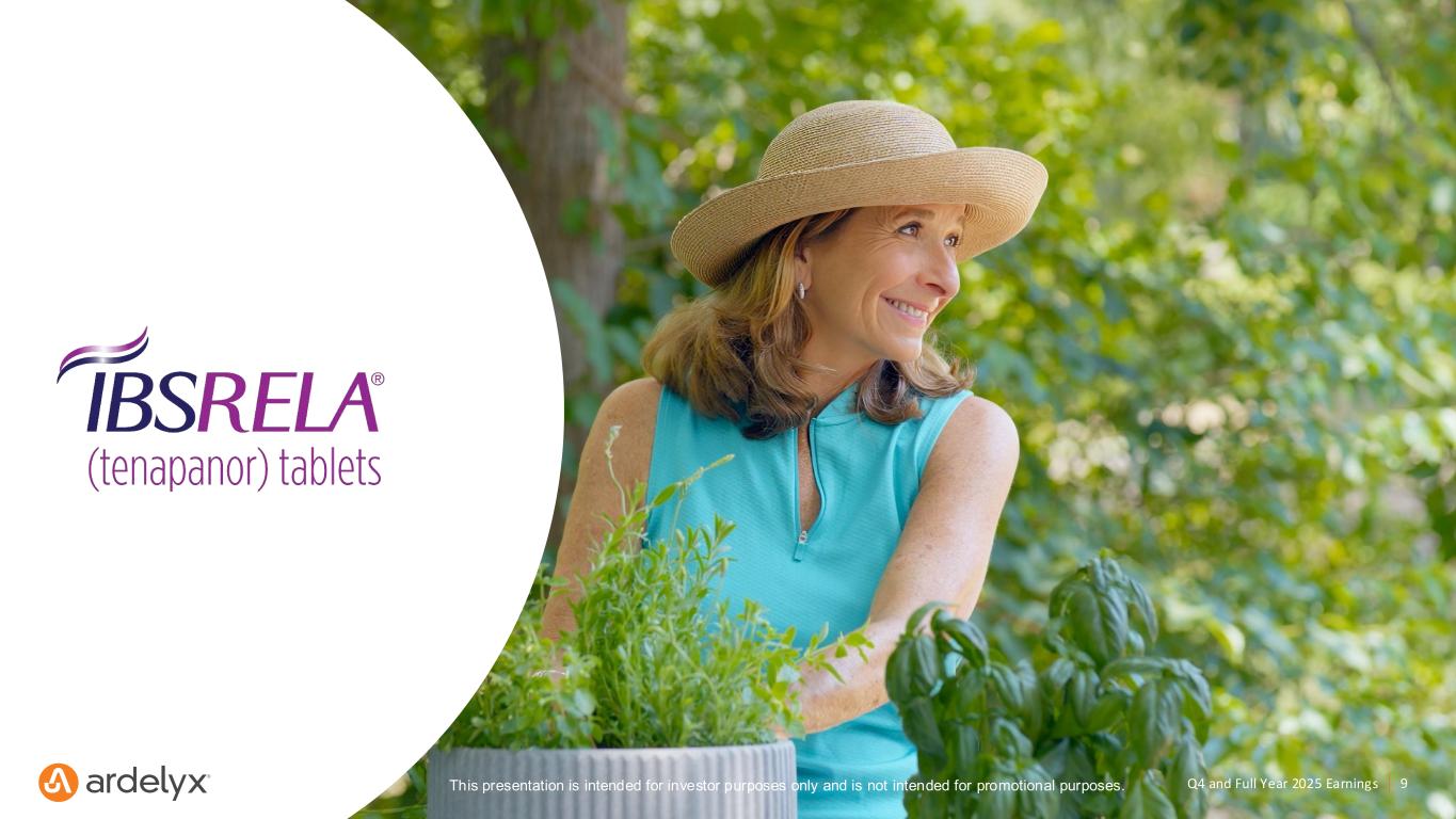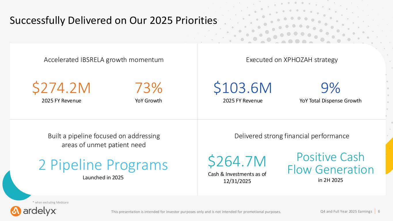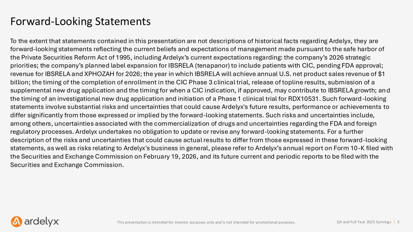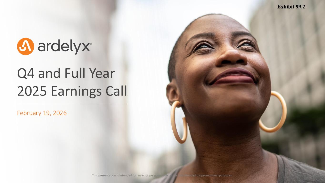 3Q4 and Full Year 2025 EarningsThis presentation is intended for investor purposes only and is not intended for promotional purposes. Forward-Looking Statements To the extent that statements contained in this presentation are not descriptions of historical facts regarding Ardelyx, they are forward-looking statements reflecting the current beliefs and expectations of management made pursuant to the safe harbor of the Private Securities Reform Act of 1995, including Ardelyx’s current expectations regarding: the company’s 2026 strategic priorities; the company’s planned label expansion for IBSRELA (tenapanor) to include patients with CIC, pending FDA approval; revenue for IBSRELA and XPHOZAH for 2026; the year in which IBSRELA will achieve annual U.S. net product sales revenue of $1 billion; the timing of the completion of enrollment in the CIC Phase 3 clinical trial, release of topline results, submission of a supplemental new drug application and the timing for when a CIC indication, if approved, may contribute to IBSRELA growth; an d the timing of an investigational new drug application and initiation of a Phase 1 clinical trial for RDX10531. Such forward -looking statements involve substantial risks and uncertainties that could cause Ardelyx's future results, performance or achievements to differ significantly from those expressed or implied by the forward-looking statements. Such risks and uncertainties include, among others, uncertainties associated with the commercialization of drugs and uncertainties regarding the FDA and foreign regulatory processes. Ardelyx undertakes no obligation to update or revise any forward-looking statements. For a further description of the risks and uncertainties that could cause actual results to differ from those expressed in these forward-looking statements, as well as risks relating to Ardelyx's business in general, please refer to Ardelyx’s annual report on Form 10 -K filed with the Securities and Exchange Commission on February 19, 2026, and its future current and periodic reports to be filed with the Securities and Exchange Commission.