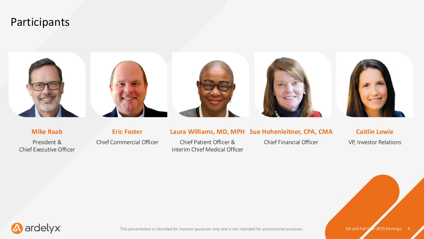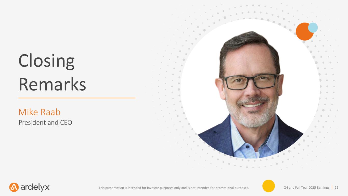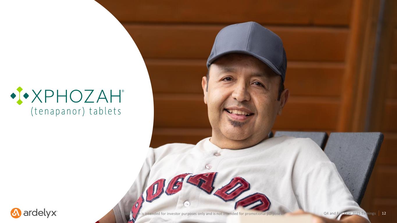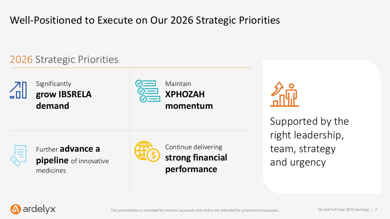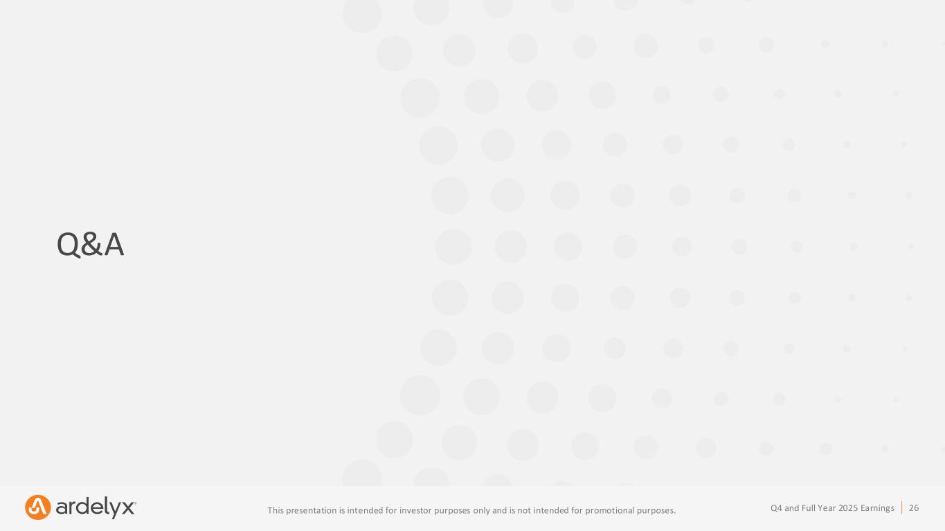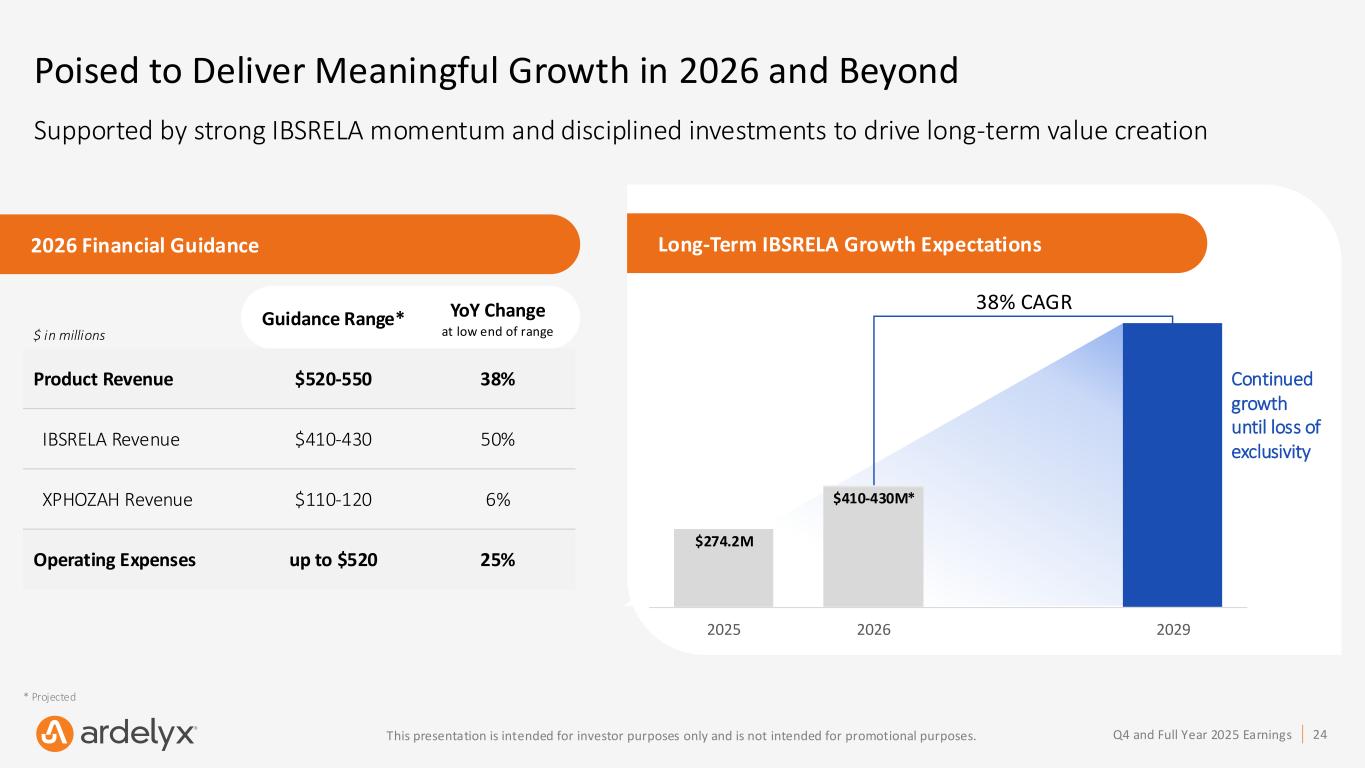 3Q4 and Full Year 2025 EarningsThis presentation is intended for investor purposes only and is not intended for promotional purposes. Forward-Looking Statements To the extent that statements contained in this presentation are not descriptions of historical facts regarding Ardelyx, they are forward-looking statements reflecting the current beliefs and expectations of management made pursuant to the safe harbor of the Private Securities Reform Act of 1995, including Ardelyx’s current expectations regarding: the company’s 2026 strategic priorities; the company’s planned label expansion for IBSRELA (tenapanor) to include patients with CIC, pending FDA approval; revenue for IBSRELA and XPHOZAH for 2026; the year in which IBSRELA will achieve annual U.S. net product sales revenue of $1 billion; the timing of the completion of enrollment in the CIC Phase 3 clinical trial, release of topline results, submission of a supplemental new drug application and the timing for when a CIC indication, if approved, may contribute to IBSRELA growth; an d the timing of an investigational new drug application and initiation of a Phase 1 clinical trial for RDX10531. Such forward -looking statements involve substantial risks and uncertainties that could cause Ardelyx's future results, performance or achievements to differ significantly from those expressed or implied by the forward-looking statements. Such risks and uncertainties include, among others, uncertainties associated with the commercialization of drugs and uncertainties regarding the FDA and foreign regulatory processes. Ardelyx undertakes no obligation to update or revise any forward-looking statements. For a further description of the risks and uncertainties that could cause actual results to differ from those expressed in these forward-looking statements, as well as risks relating to Ardelyx's business in general, please refer to Ardelyx’s annual report on Form 10 -K filed with the Securities and Exchange Commission on February 19, 2026, and its future current and periodic reports to be filed with the Securities and Exchange Commission.