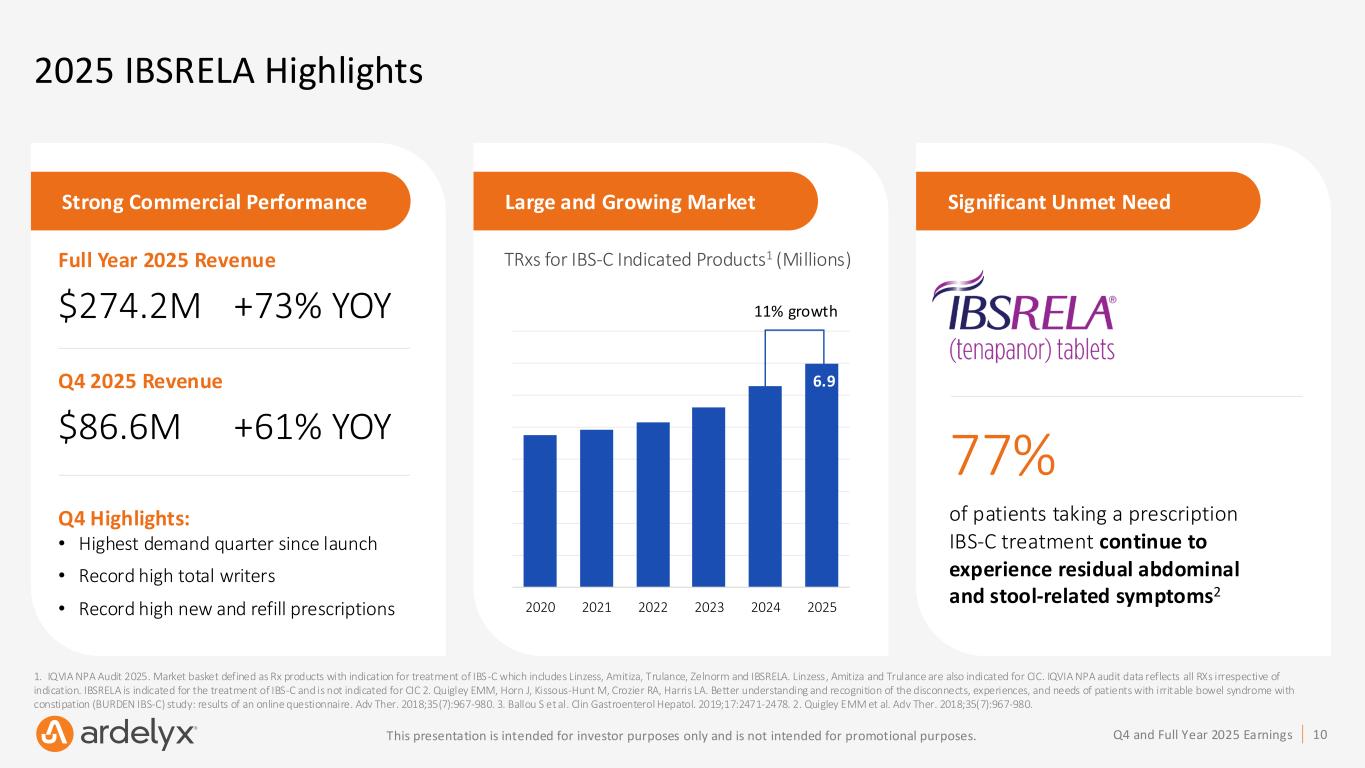 10Q4 and Full Year 2025 EarningsThis presentation is intended for investor purposes only and is not intended for promotional purposes. 2025 IBSRELA Highlights 1. IQVIA NPA Audit 2025. Market basket defined as Rx products with indication for treatment of IBS-C which includes Linzess, Amitiza, Trulance, Zelnorm and IBSRELA. Linzess, Amitiza and Trulance are also indicated for CIC. IQVIA NPA audit data reflects all RXs irrespective of indication. IBSRELA is indicated for the treatment of IBS-C and is not indicated for CIC 2. Quigley EMM, Horn J, Kissous-Hunt M, Crozier RA, Harris LA. Better understanding and recognition of the disconnects, experiences, and needs of patients with irritable bowel syndrome with constipation (BURDEN IBS-C) study: results of an online questionnaire. Adv Ther. 2018;35(7):967-980. 3. Ballou S et al. Clin Gastroenterol Hepatol. 2019;17:2471-2478. 2. Quigley EMM et al. Adv Ther. 2018;35(7):967-980. Strong Commercial Performance Large and Growing Market Significant Unmet Need 77% of patients taking a prescription IBS-C treatment continue to experience residual abdominal and stool-related symptoms2 TRxs for IBS-C Indicated Products1 (Millions) 2020 2021 2022 2023 2024 2025 6.9 11% growth Q4 Highlights: • Highest demand quarter since launch • Record high total writers • Record high new and refill prescriptions Full Year 2025 Revenue $274.2M +73% YOY Q4 2025 Revenue $86.6M +61% YOY