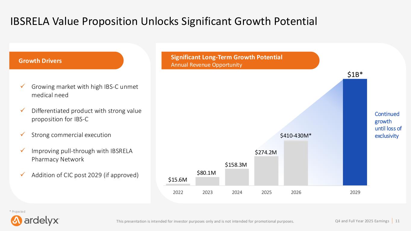 Ardelyx expects continued growth in 2026 and beyond, driven by increased depth and breadth of prescribing among target healthcare providers, increased engagement with patients with irritable bowel syndrome with constipation (IBS-C) as well as further improved prescription pull-through.