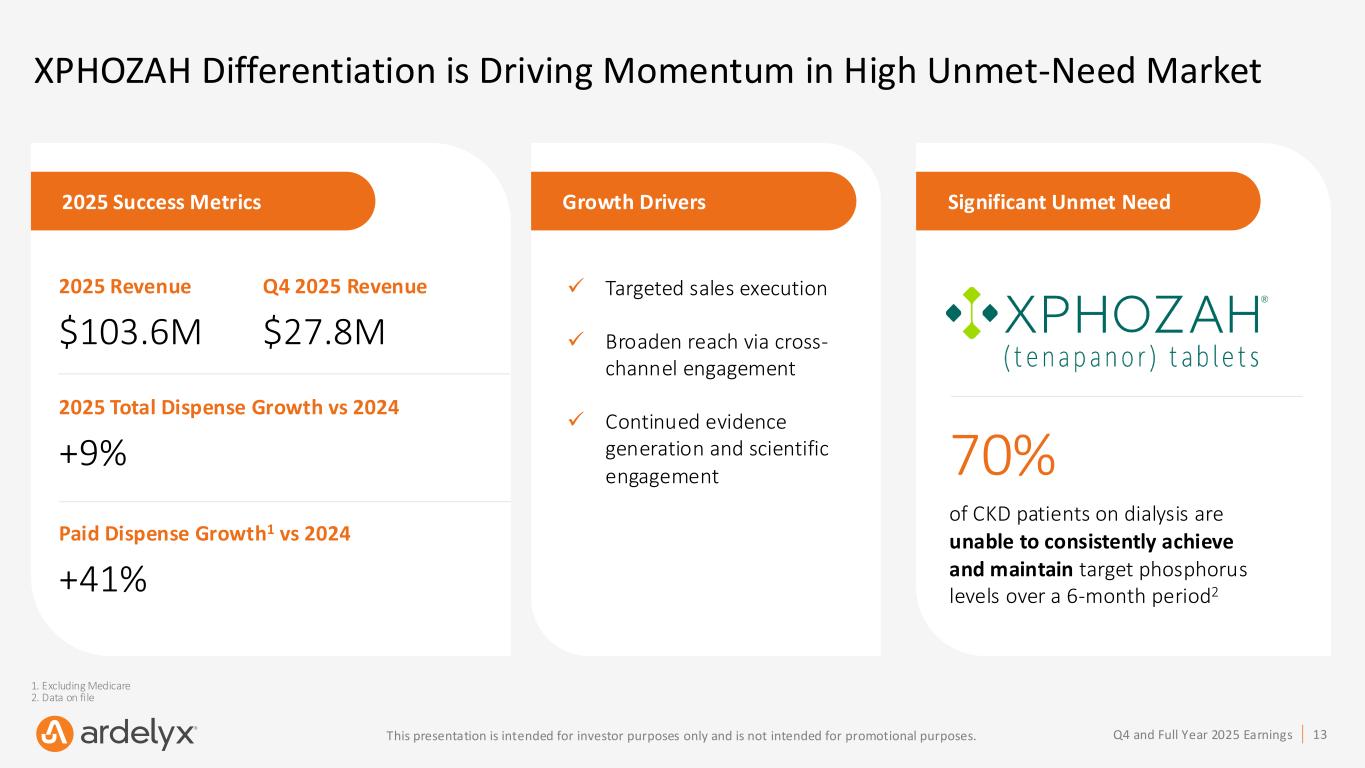 Ardelyx expects growth in 2026 to be driven by increased clinical conviction and writing among target healthcare prescribers. Ardelyx expects full-year 2026 XPHOZAH revenue to be between $110 and $120 million.