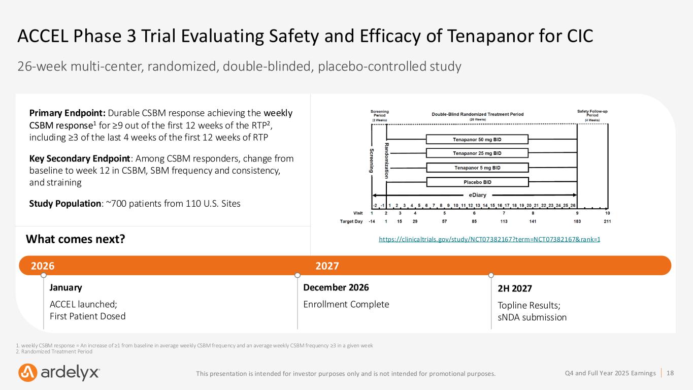 18Q4 and Full Year 2025 EarningsThis presentation is intended for investor purposes only and is not intended for promotional purposes. ACCEL Phase 3 Trial Evaluating Safety and Efficacy of Tenapanor for CIC 26-week multi-center, randomized, double-blinded, placebo-controlled study What comes next? January ACCEL launched; First Patient Dosed December 2026 Enrollment Complete 2H 2027 Topline Results; sNDA submission 2026 2027 Primary Endpoint: Durable CSBM response achieving the weekly CSBM response1 for ≥9 out of the first 12 weeks of the RTP2, including ≥3 of the last 4 weeks of the first 12 weeks of RTP Key Secondary Endpoint: Among CSBM responders, change from baseline to week 12 in CSBM, SBM frequency and consistency, and straining Study Population: ~700 patients from 110 U.S. Sites https://clinicaltrials.gov/study/NCT07382167?term=NCT07382167&rank=1 1. weekly CSBM response = An increase of ≥1 from baseline in average weekly CSBM frequency and an average weekly CSBM frequency ≥3 in a given week 2. Randomized Treatment Period
