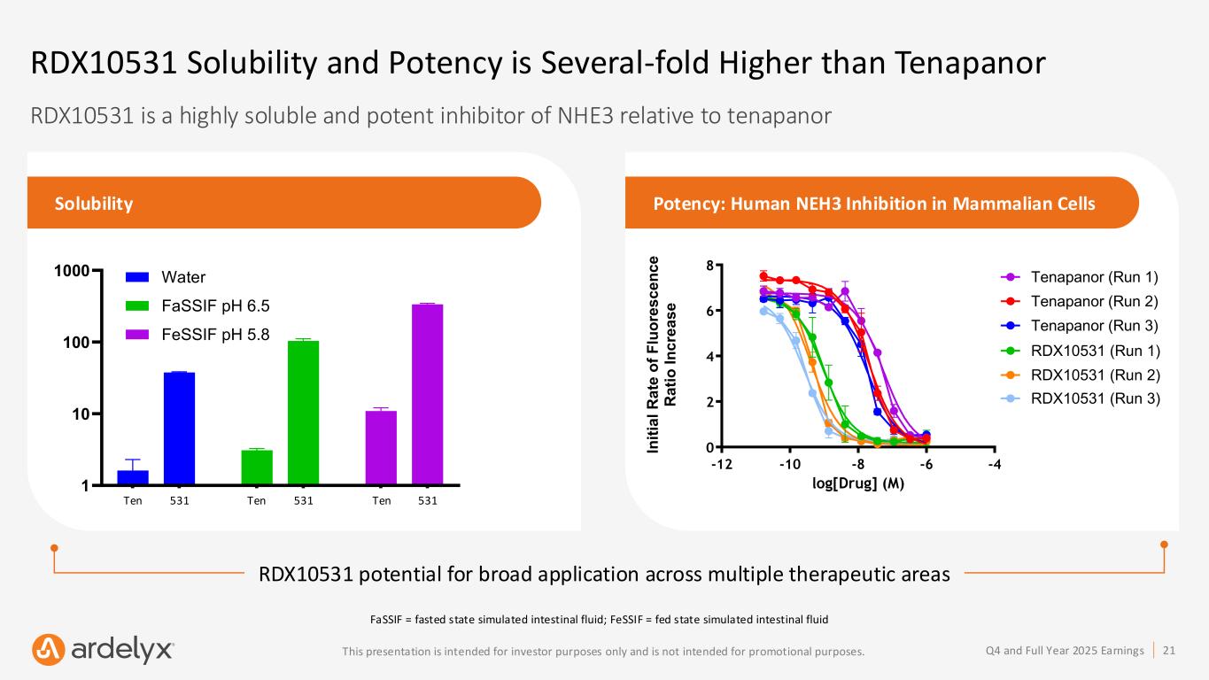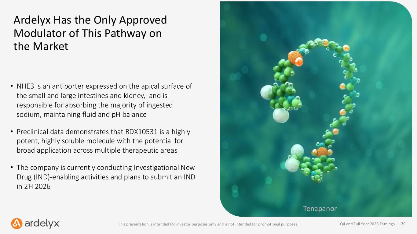 20Q4 and Full Year 2025 EarningsThis presentation is intended for investor purposes only and is not intended for promotional purposes. • NHE3 is an antiporter expressed on the apical surface of the small and large intestines and kidney, and is responsible for absorbing the majority of ingested sodium, maintaining fluid and pH balance • Preclinical data demonstrates that RDX10531 is a highly potent, highly soluble molecule with the potential for broad application across multiple therapeutic areas • The company is currently conducting Investigational New Drug (IND)-enabling activities and plans to submit an IND in 2H 2026 Ardelyx Has the Only Approved Modulator of This Pathway on the Market Tenapanor